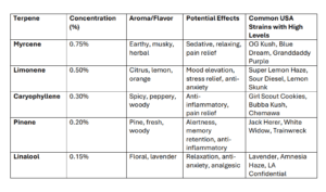 Here’s a detailed table summarizing the most common terpenes found in USA cannabis strains, their aroma, effects, and common examples of strains: